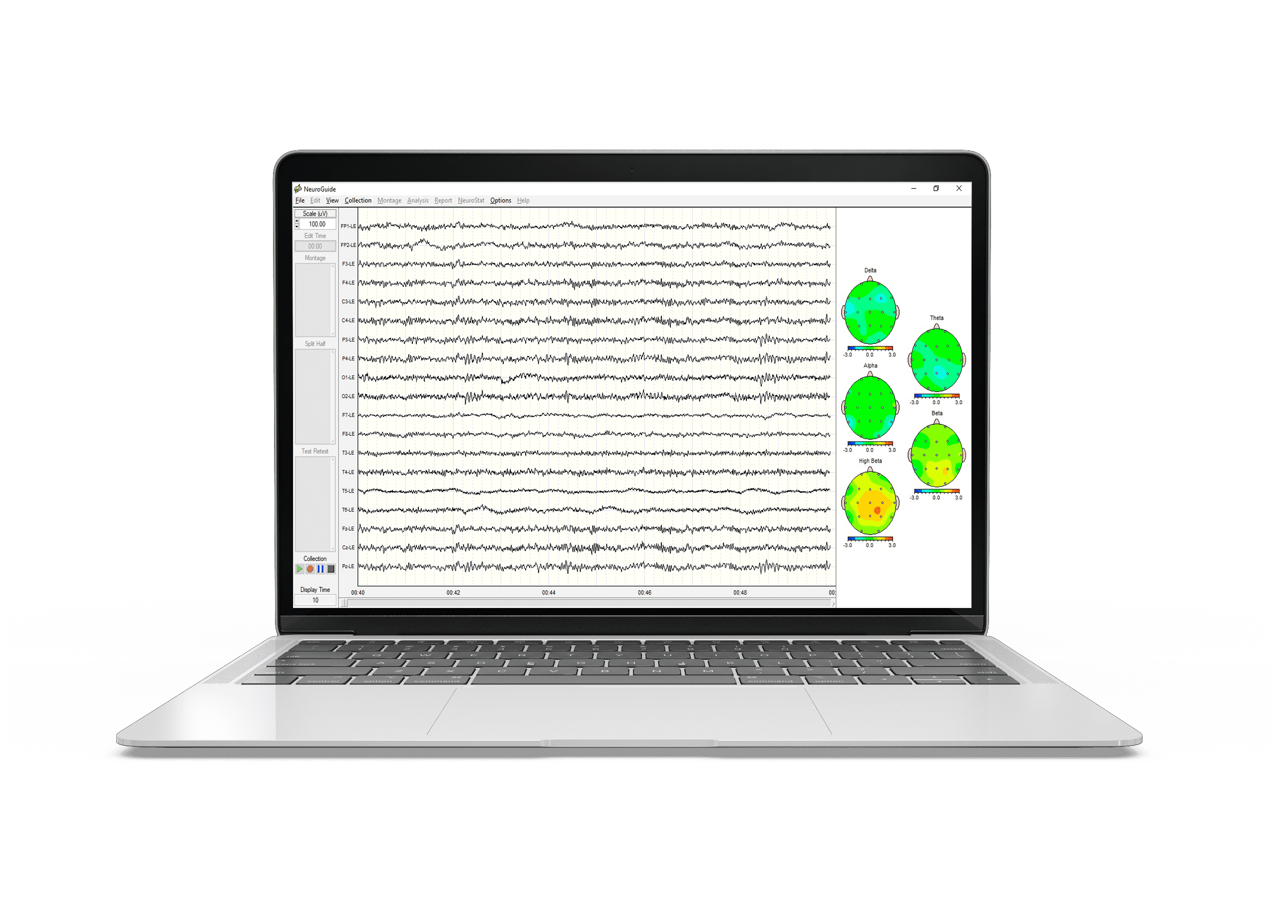 NeuroGuide نمای گذشتهنگر از شکل موج EEG و رد مصنوع آفلاین را ارائه میدهد. NeuroGuide همچنین محاسبات انرژی طیفی، توان و انسجام همراه با عملکردهای متمایز، سیگنال ژنراتور، هنجارهای LORETA و شاخص عملکرد مغز (اطلاعات QEEG) را ارائه میدهد.